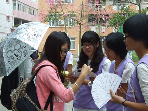 本网讯 2012年10月24、25日中午及下午,在云山学12栋前进行了校园古典诗词赋创作大赛的优秀作品展示活动。不同于往届通过晚会来展示优秀作品的方式,本次诗词赋大赛选择将一等奖作品印在屏风上进行校道展示,同时将它们制作成精美的书签,让对诗词赋感兴趣的同学可以挑选自己喜欢的作品书签留作纪念。据了解,在所有派送的书签中,最受欢迎的是印有本届诗词赋创作大赛冠军获得者、来自中文学院文管092班的吴晓丹同学所作的《金镂曲》的绿色书签。而其中的一句“醉看谁主九州权斗”,恰好也生动表现了此次大赛优秀作品的丰富之状。