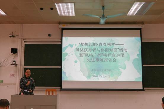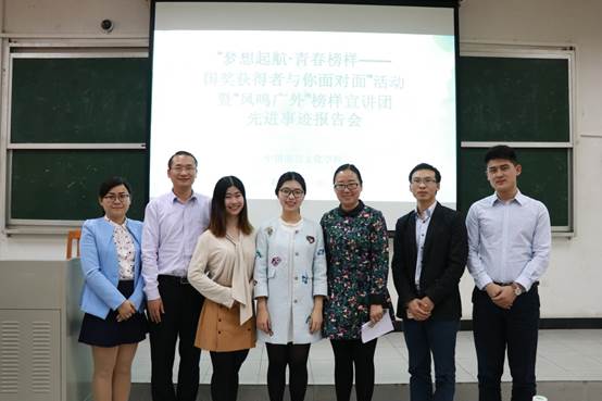 本网讯 3月30号下午三点,“梦想起航•青春榜样——国奖获得者与你面对面”活动暨“凤鸣广外”榜样宣讲团先进事迹报告会在二教219如期举行。出席本次活动的嘉宾有:校学生处副处长国佳,我院党委副书记李江,辅导员老师王秋萍、曾超文、杨韬,国奖获得者吴雨晨、梁珊珊。我院全体2016级本科生参加本次活动。