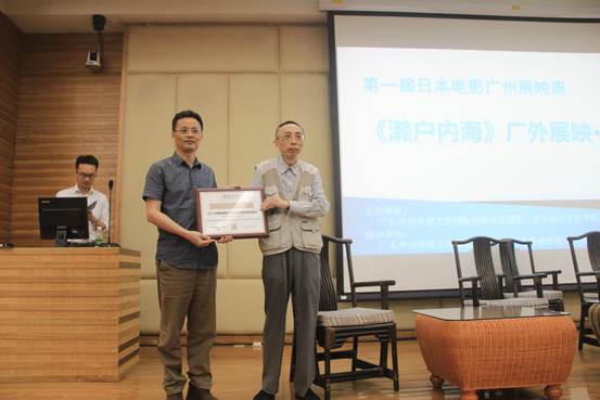观影结束后,广东电影行业协会秘书长郑大卫先生为我校颁发2017国际电影文化交流指定放映场所荣誉证书。随后座谈会嘉宾与主持人上台就坐,大森立嗣导演与近藤贵彦制作人先对影片制作过程及影片在中国展映作简要阐述和评价,大森立嗣表示:“影片投入非常少,制作周期极短,能在中国上映对我来说是十分高兴以及非常奇妙的一件事。” 近藤贵彦补充道:“我们想用不善于与人交流的内海与恋爱总是受挫的濑户这两个角色,体现朋友间一起克服困难,在平凡人生活里也能活出精彩。” 近藤贵彦还谈到:“影片特地采用了明快的音乐,与慢节奏的故事情节相辅相成,推动情节发展。”