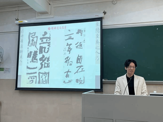 其后,李广辉教授也将他带过来的书法作品赠予中文学院,由广东外语外贸大学中国语言文化学院党委副书记王迪接受赠书。聘请及赠书仪式结束后,李广辉教授就“中国书法:东方美学哲学思维活动”主题展开了一场讲座。他就具体的书法作品,结合自己多年的书法学习经验,分享了自己对于书法中的美学的思考,在书法作品的对比中深入浅出地讲解了汉字演变过程中出现的不同字形的特点,对同学们在评价书法作品方面给出了建议,并鼓励大家练习书法,在运笔挥毫中感受中华文化的魅力。