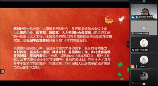 2021年4月16日下午,中文学院西部计划、征兵入伍宣讲会在线上举行。活动由我院副书记王迪主持,并特别邀请了省团委青年志愿者行动指导中心团干李丽英老师、广东外语外贸大学保卫处朱永海老师以及广外国政专业参军退役学生翁博洋。他们为我院学生做了一场具有针对性的、专门性的西部计划及征兵入伍宣讲会。本次会议充分体现了学院对国家相关政策的支持、对学生未来发展规划及职业发展方向的充分关注。