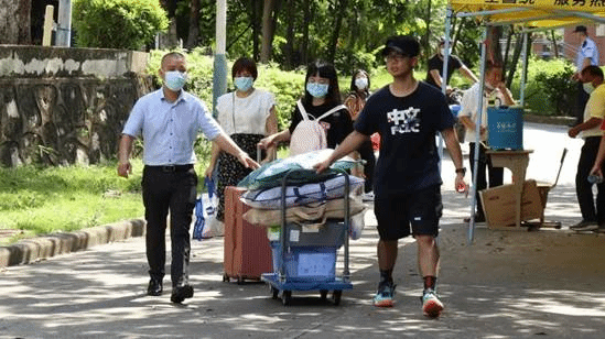 我院在入校沿途设置了多个志愿者服务点,为新生指引路线,提供帮助。志愿者们会用小推车为行李较多的学生提供搬运服务,方便学生到达宿舍。