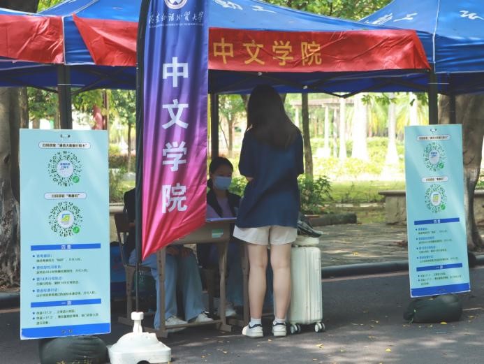 我院在西门校道设立“中文学院返校生接待区”,进行入校后的学院复查等工作。志愿者们在学院摊位等待返校生的到来,并指引返校生在“我在校园”小程序确认返校。同时,另一批志愿者在二教教室中帮助同学们进行签到。截至8月27日,中文学院老生已基本平安返校。