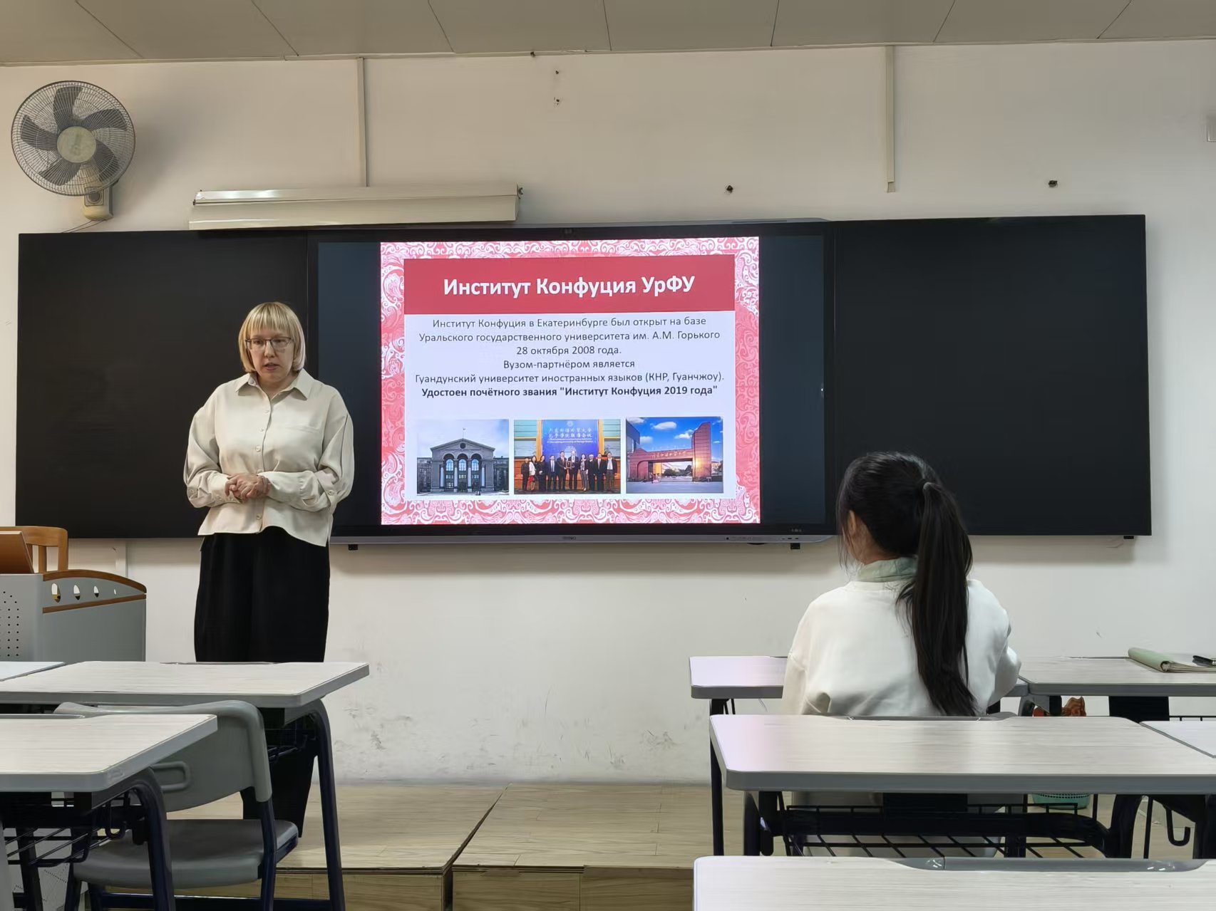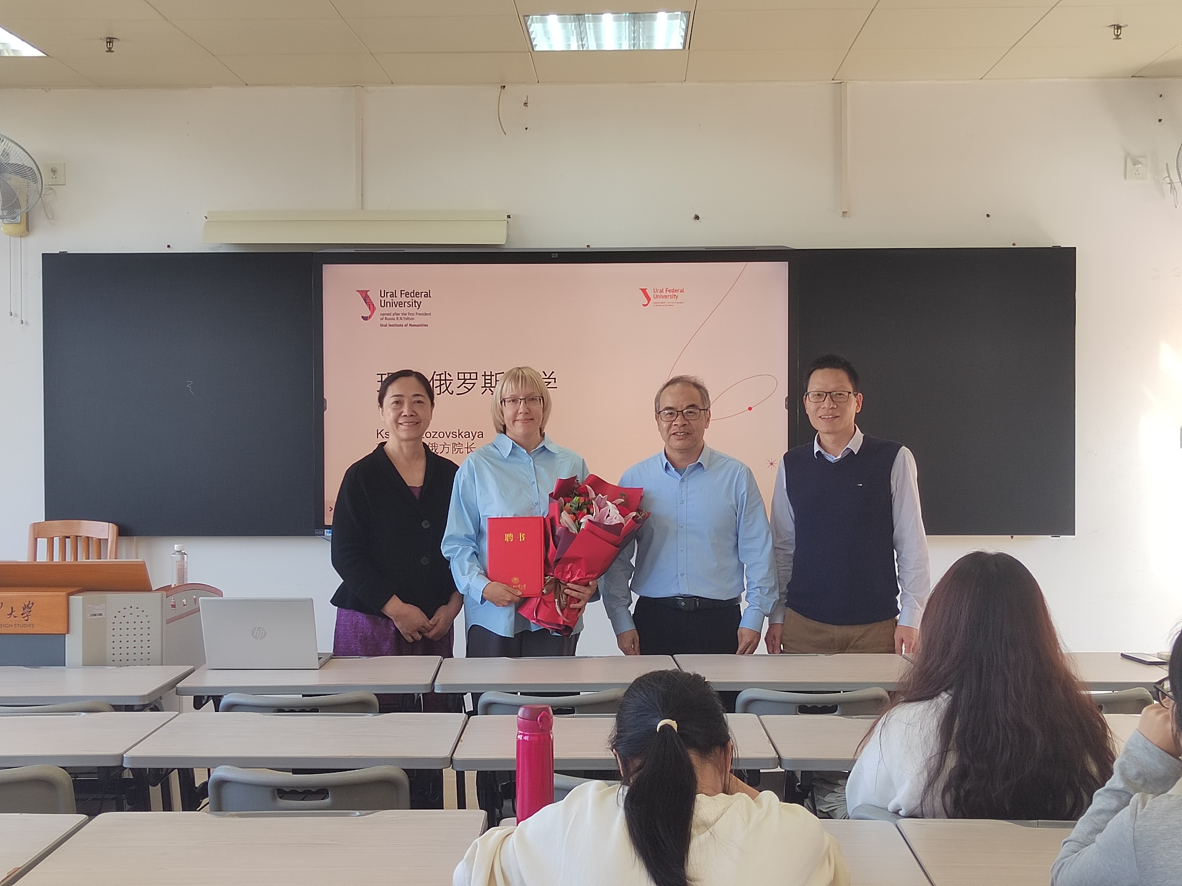 11月24日为第一场讲座。讲座开始前,中文学院院长陈恩维教授为克谢尼娅博士颁发国际中文教育行业专家聘书,标志着双方在中俄教育与交流领域的合作迈出坚实一步。
