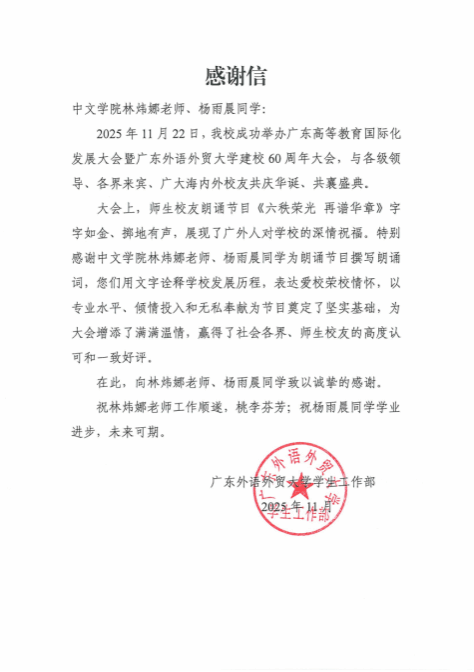 2025年11月22日,广东高等教育国际化发展大会暨广东外语外贸大学建校60周年大会盛大启幕,由中文学院汉语言文学专业林炜娜老师、杨雨晨同学主创的朗诵节目《六秩荣光 再谱华章》作为献礼环节精彩呈现,深情传递广外人对母校的眷恋与祝福。
