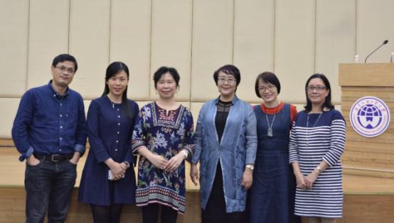 (张翎与到场的中文学院老师合照。左一起:朱志刚、林炜娜、张翎、刘海玲、申霞艳、李惠娟)