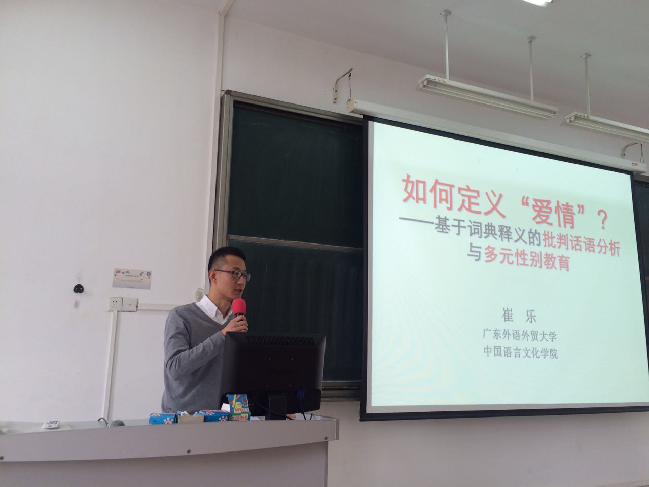 我校中文学院汉语国际教育中心崔乐博士应邀参加了本次研讨会,并宣读了论文《如何定义“爱情”?——基于词典释义的批判话语分析与多元性别教育》。文章应用批判话语分析方法揭示词典释义中的性别意识形态,阐述语言、身份与社会结构的关系,获得与会专家的一致肯定。