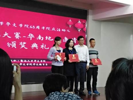 2018年11月10日,“汉语微课大赛”华南地区邀请赛决赛在暨南大学华文学院举行,我校中文学院汉硕研究生谢瑶、付美佳、汉语国际教育专业本科生杨凯如在比赛中取得优异成绩。