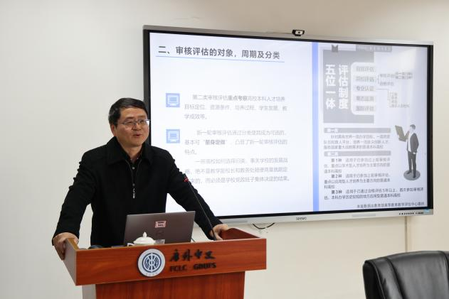 袁长青主任以“新一轮审核评估方案解读及自评自建”为主题对本科教育教学审核评估工作政策进行解读。他围绕“什么是审核评估”“审核评估的对象、周期及分类”“审核评估的程序”“审核评估的指标释义”及“学院如何开展自建自评”五个方面进行了全面深入的阐述,强调要以正确的态度看待评估,积极配合做好各项工作。