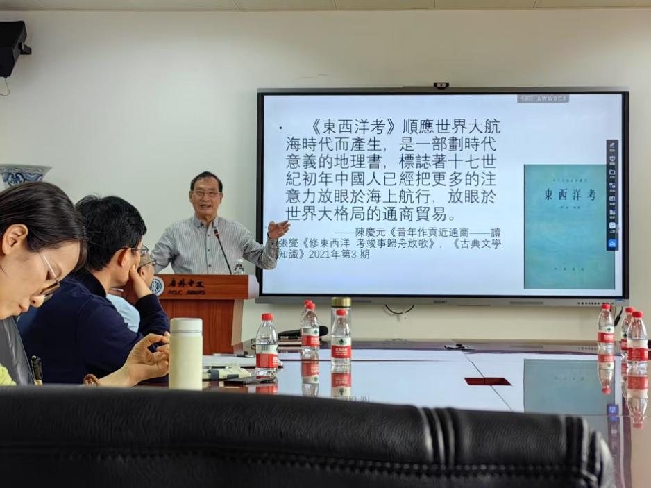 2025年3月1日下午,福建师范大学文学院教授陈庆元在白云山校区七教408会议室作题为《张燮创建中国“海学”的划时代意义》专题讲座。讲座由院长陈恩维主持,多名师生参会。讲座上,陈庆元教授主要从张燮的生平、家世及其主要著作、《东西洋考》写作缘起、《东西洋考》写作的两个阶段,创建中国“海学”的划时代意义、拓展张燮研究的范围等几个方面展开,深入浅出、形象生动地讲解了张燮创建中国“海学”的划时代意义。