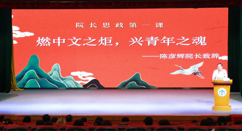 陈彦辉院长这堂“思政课”的题目是《燃中文之炬,兴青年之魂》。他首先对三百多位新生的到来表示了欢迎,随后带领新生们回溯中文学院历史沿革,了解学院概况。