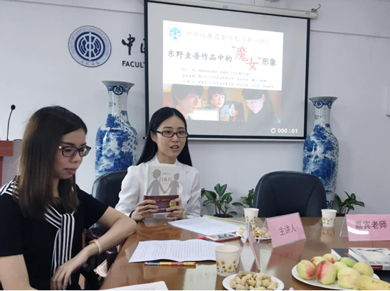 本网讯 2016年4月28日下午,中文学院在读研究生在三教422会议室举办了一场主题为东野圭吾作品中的“魔女”形象的中外名著学术沙龙。参加沙龙的除了中文学院的在读研究生外,还有东野圭吾作品的爱好者们。本次沙龙的主讲人为中文学院文艺学在读研究生罗曼莹,她以《白夜行》中的女主角唐泽雪穗为例,与大家一起探讨对“魔女”形象的理解及其背后的含义。