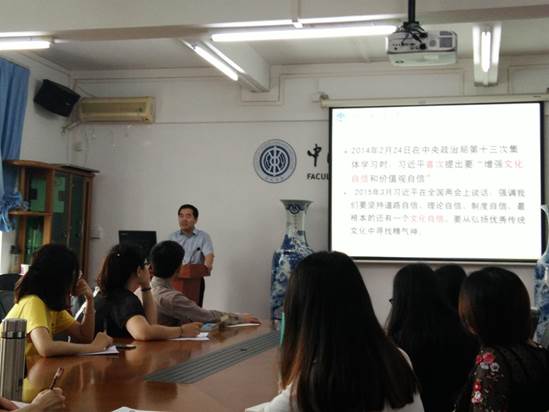 2018年5月10日下午两点,我院在中文学院会议室开展了“文化自信与文化强国建设”主题党课学习活动。本次党课学习由中文学院院长陈彦辉主讲。参与学习的有中文学院全体研究生党员。