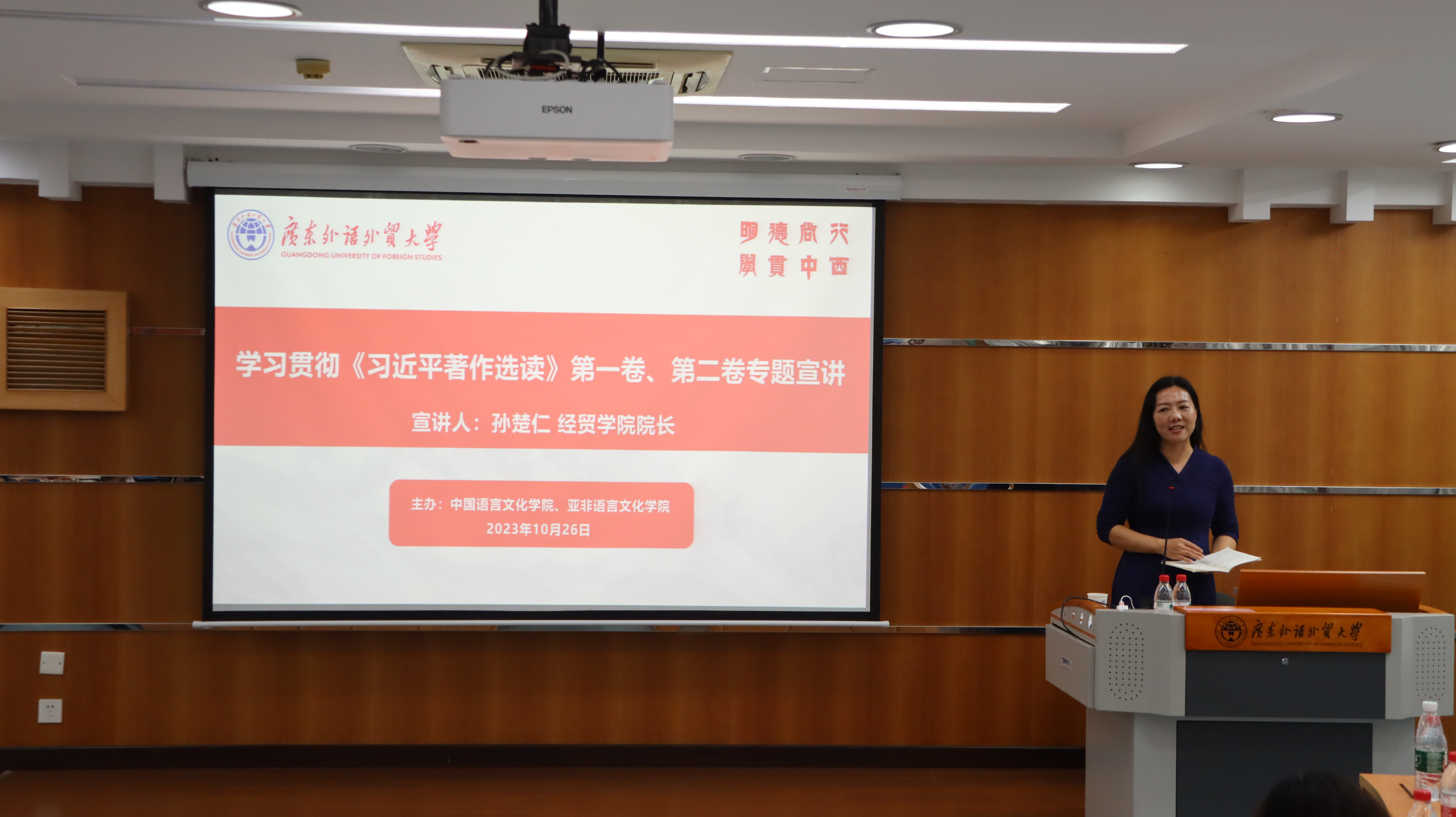 本网讯  1026日下午,中文学院党委和亚非学院党委在九教305联合开展习近平著作选读》第一卷、第二卷专题宣讲会。本次宣讲会由经济贸易学院院长孙楚仁进行宣讲,亚非语言文化学院党委书记梁洁担任主持,中文学院党委书记谢秀兰做总结发言。中文学院和亚非学院的师生党员参加了会议。