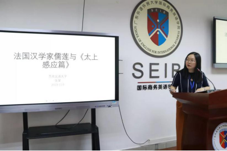 张粲老师汇报了名为《法国汉学家儒莲与<太上感应篇>》的报告,先后介绍了儒莲的汉学研究经历和成就、《太上感应篇》和儒莲的翻译等内容,总结了儒莲翻译的《太上感应篇》的优点,即译著规模和质量超越前人、对道教持客观态度,体现其中国文化的尊重。