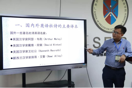 其后,高超老师带来《从比较视野看宇文所安的杜甫诗歌英译》的报告对比了宇文所安和其他三位翻译家翻译的杜甫的《登岳阳楼》中的韵律、对仗、格式、意韵的差异,提出诗歌翻译应做到不刻意追求押韵,而要努力做到意韵和对仗工整形式之间的平衡。