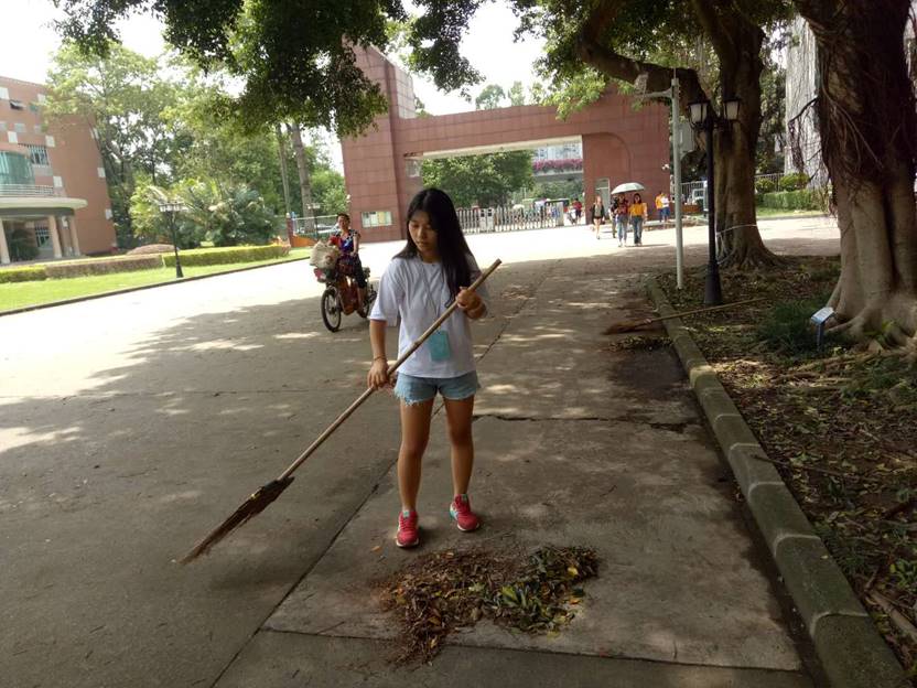 当天,中文团学共组织33位志愿者,在校学生会的统一安排下参与到学校的灾后清理工作。在西门、在校道、在一教广场,哪里有需要,哪里就有中文学子。因为时间比较紧迫,不少团学干部都是上完课后马上赶来清理现场,连吃饭的时间都没有。他们忙碌的身影,诠释了何为“中文团学 一心为你 你的微笑 我的骄傲”,阳光下的他们,成为广外一道靓丽的风景线。