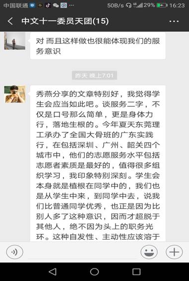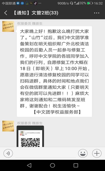 看到昔日美丽的校园被台风摧残,以“中文团学 一心为你 你的微笑 我的骄傲”为宗旨的中文团学开始思考,我们平时经常谈“为同学服务”,“为学校分忧”,这个时候,我们是不是应该做点什么?于是,在中文团学的微信群里,掀起了一场讨论……