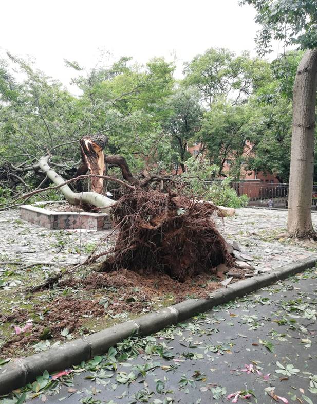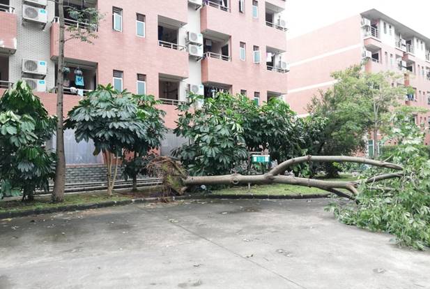 2018年9月17日,台风“山竹”过境之后,广外校园里不少树木倒塌,一片狼藉。