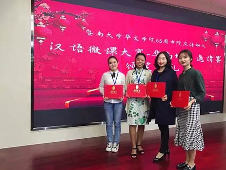2018年11月10日,“汉语微课大赛”华南地区邀请赛决赛在暨南大学华文学院举行,我校中文学院汉硕研究生谢瑶、付美佳、汉语国际教育专业本科生杨凯如在比赛中取得优异成绩。