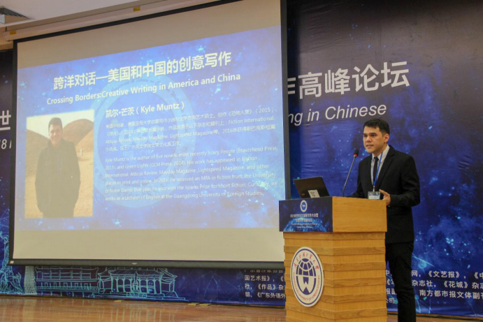 随后是Kyle Muntz发表演说。他以《跨洋对话——美国和中国的创意写作》为发言题目,阐述了自己亲身感受到的中美创意写作的差异。他先以美国创意写作课堂的学习方法为例,以此说明创意写作教学应该要发挥学生们的主观能动性,使学生在阅读中模仿、体验与进步。他提出以下观点:“老师们应该以读者的角度看待学生作品,对作品的表达与分析进行讨论,给学生以实用的建议,使每个学生形成独特风格。”谈及在中国执教的感想,他表示:“创意写作是高级英语习得的重要途经,能够锻炼学生的表达和阅读能力。”他肯定中国学生努力学习的精神,同时期待在教学中能更多地发挥学生的主体作用,开发学生的想象力。