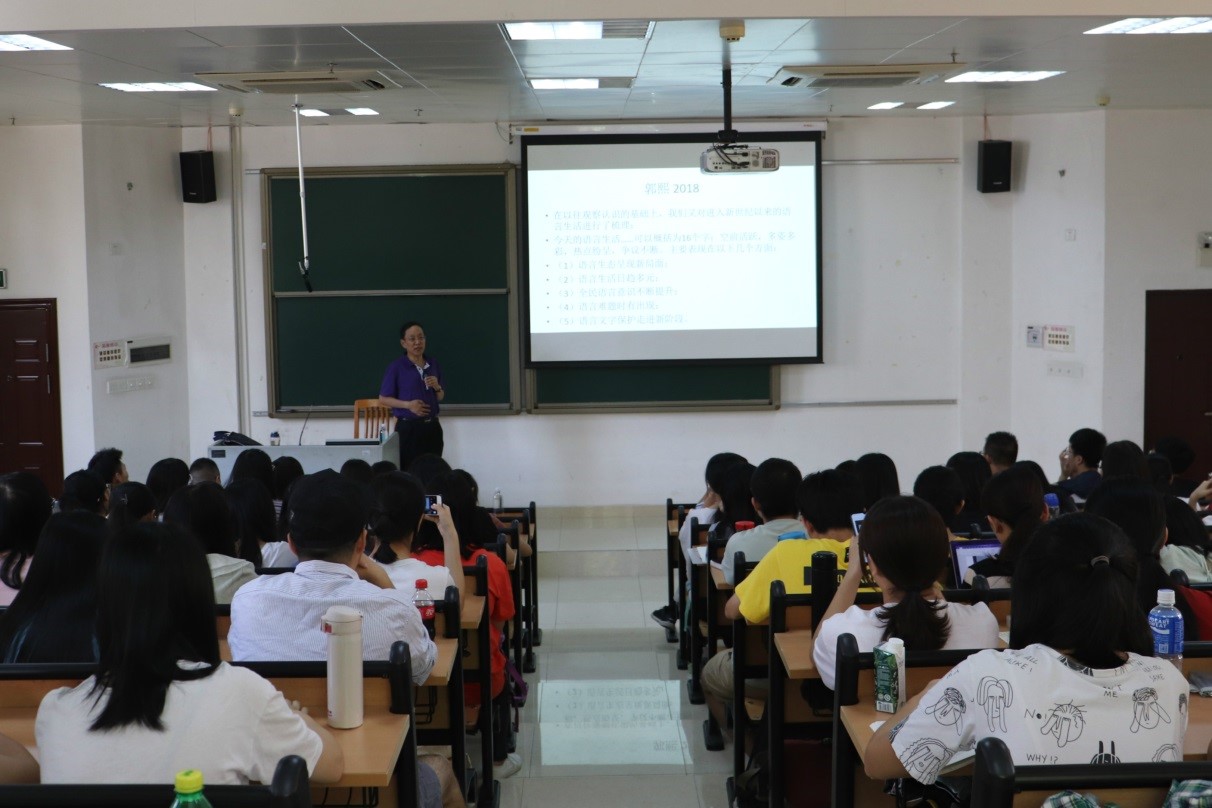 郭熙教授是国内知名社会语言学专家,自上个世纪80年代开始关注身边的语言生活变化并展开深入研究。他向在场师生分享了自己的研究成果。1998年,郭熙教授提出三个现象:大量超规范现象步入大众传媒、一些南方有影响的方言向北挺进、外来语直接进入了汉语交际圈。2004年,他对上面的描述做了修正,但仍然停留在“现象”上。2005年,第一部《中国语言生活状况报告》在描述现象的同时,注意到了变化的隐性方面。对于当今社会热点和争议不断的语言生活,郭熙教授总结出五个表现:语言生态呈现新局面,语言生活日趋多元,全民语言意识不断提升,语言难题时有出现和语言文字保护走进新阶段。