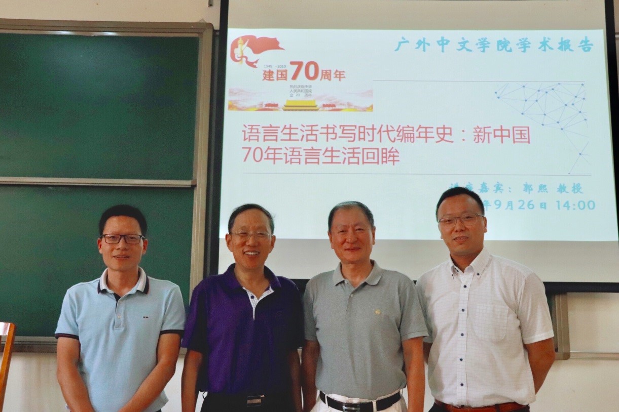 9月26日下午,中文学院对外汉语系教工党支部在北校区七教213开展“不忘初心、牢记使命”主题党日活动,邀请暨南大学华文学院郭熙教授为在场师生作“新中国70年语言生活回眸”的主题讲座。中文学院、英文学院、翻译学院100余名师生参加,会议由支部党员汪磊教授主持。