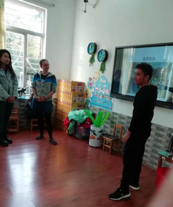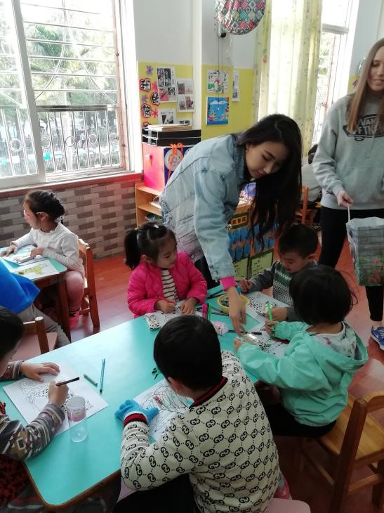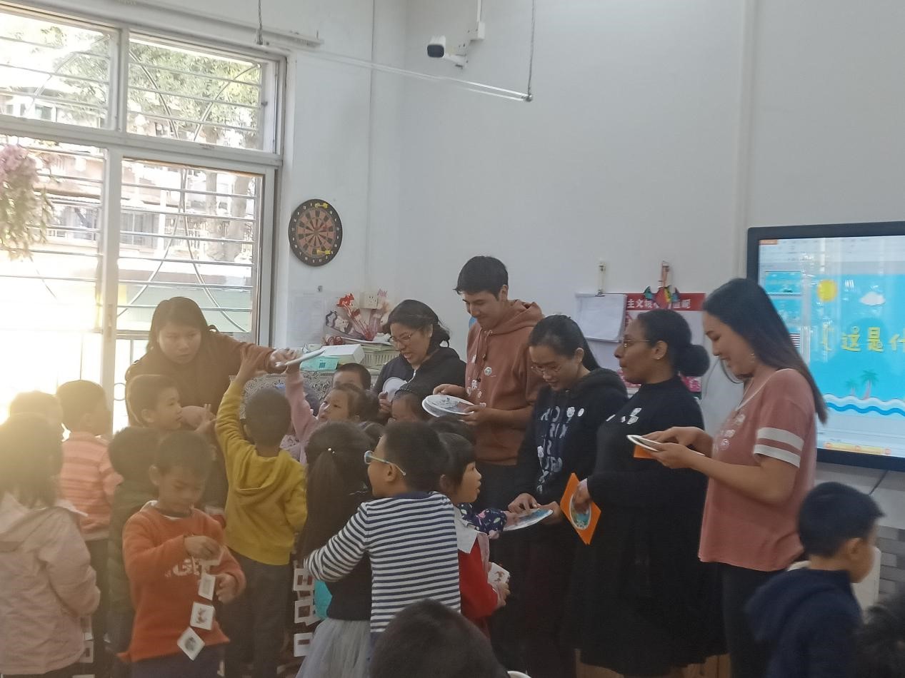 最后,老师们给孩子们送礼物并与孩子们合影留念。义教活动接近尾声,细心的老师们还给小朋友准备了特别的礼物——手工制作的国旗卡片。老师给孩子们分派礼物时,孩子们非常高兴和感动,一些小朋友甚至还跑到老师跟前与老师拥抱。同时小朋友们也回赠了贴纸和手工制作的盘子给老师们,教室里洋溢着欢乐的气氛。