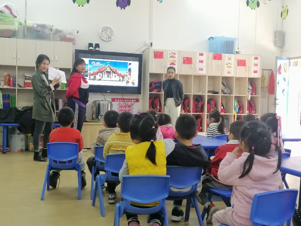 六个泰国同学负责给中一班进行义教。义教主题为“我们一起去泰国吧”。泰国同学的教学活动分两个环节。第一个环节是介绍泰国的国旗、泰国的著名景点、代表动物以及泰国有名的水果。