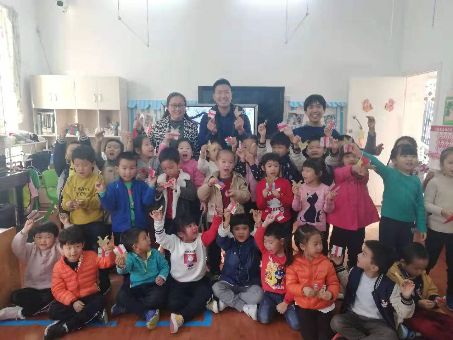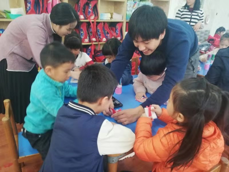 最后长野匡同学和镰田隆希同学赠送给每个小朋友一只他们亲手折的驯鹿折纸礼物,并让小朋友自己画上驯鹿的眼睛、鼻子和嘴巴,小朋友们非常开心。日本同学的义教活动结束后,义教老师和小朋友们合影留念。