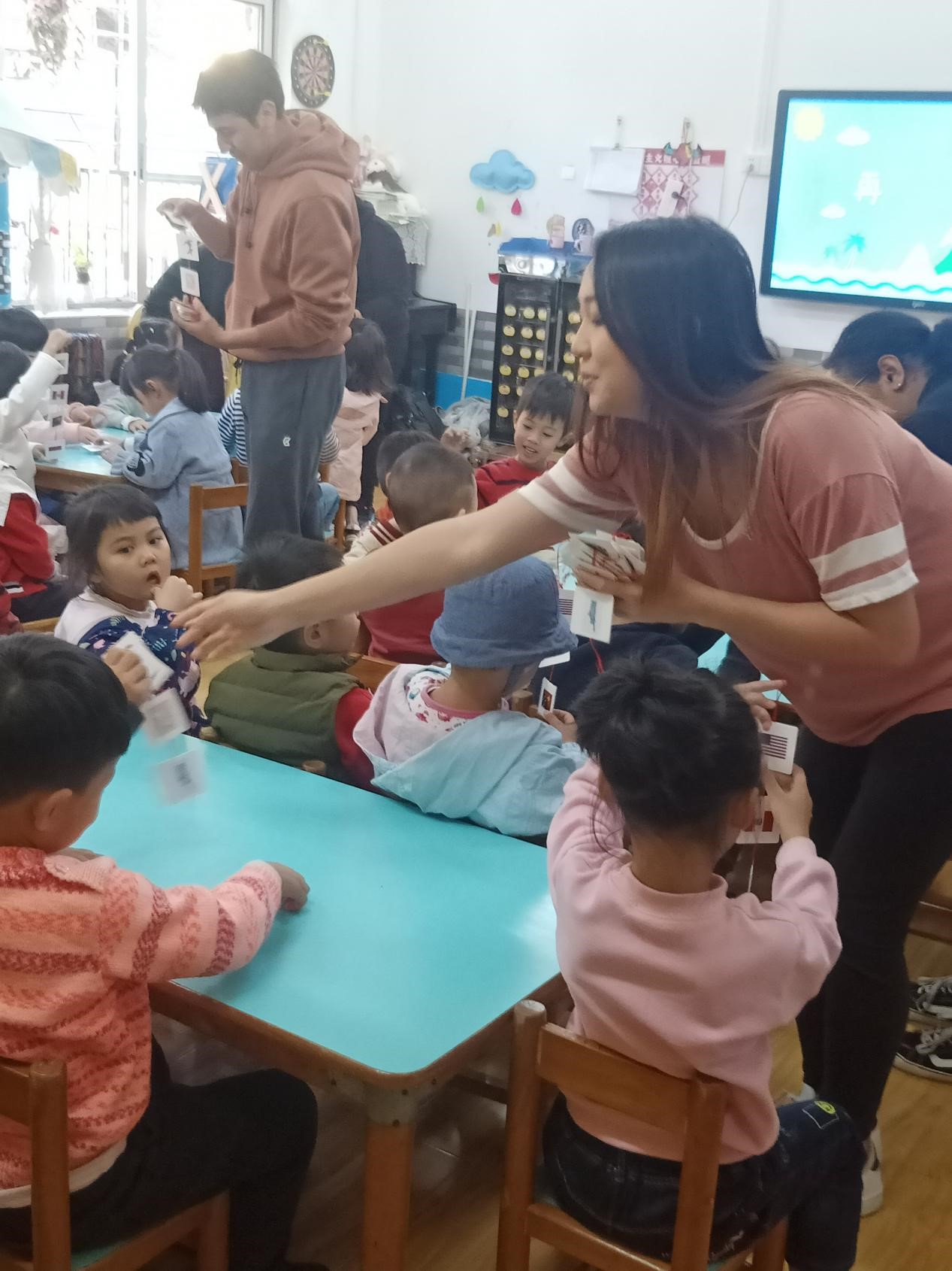 第三个环节是老师与小朋友们围绕“认识国家”的主题玩游戏。老师和小朋友玩了投骰子、拼图等游戏,并邀请每组的小朋友和幼儿园的老师一起玩卡片游戏。小朋友投入其中,都能很快说出答案,积极配合和回应老师。冬日里窗外阳光透入教室,形成一圈圈的光晕,老师和孩子们的笑容也犹如这冬日的阳光,温暖了寒冬中的我们。