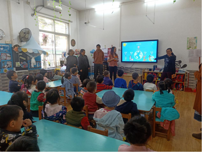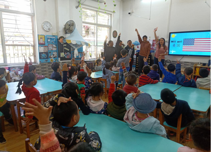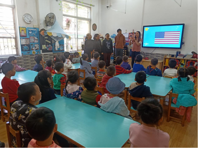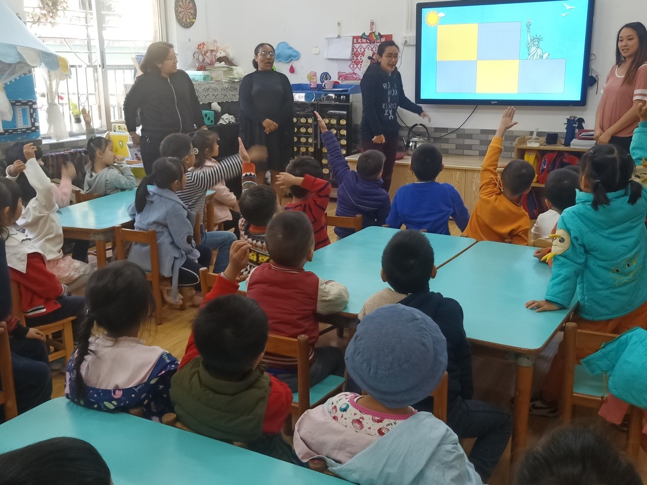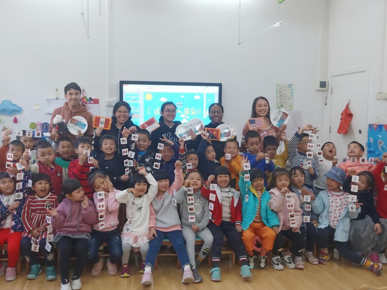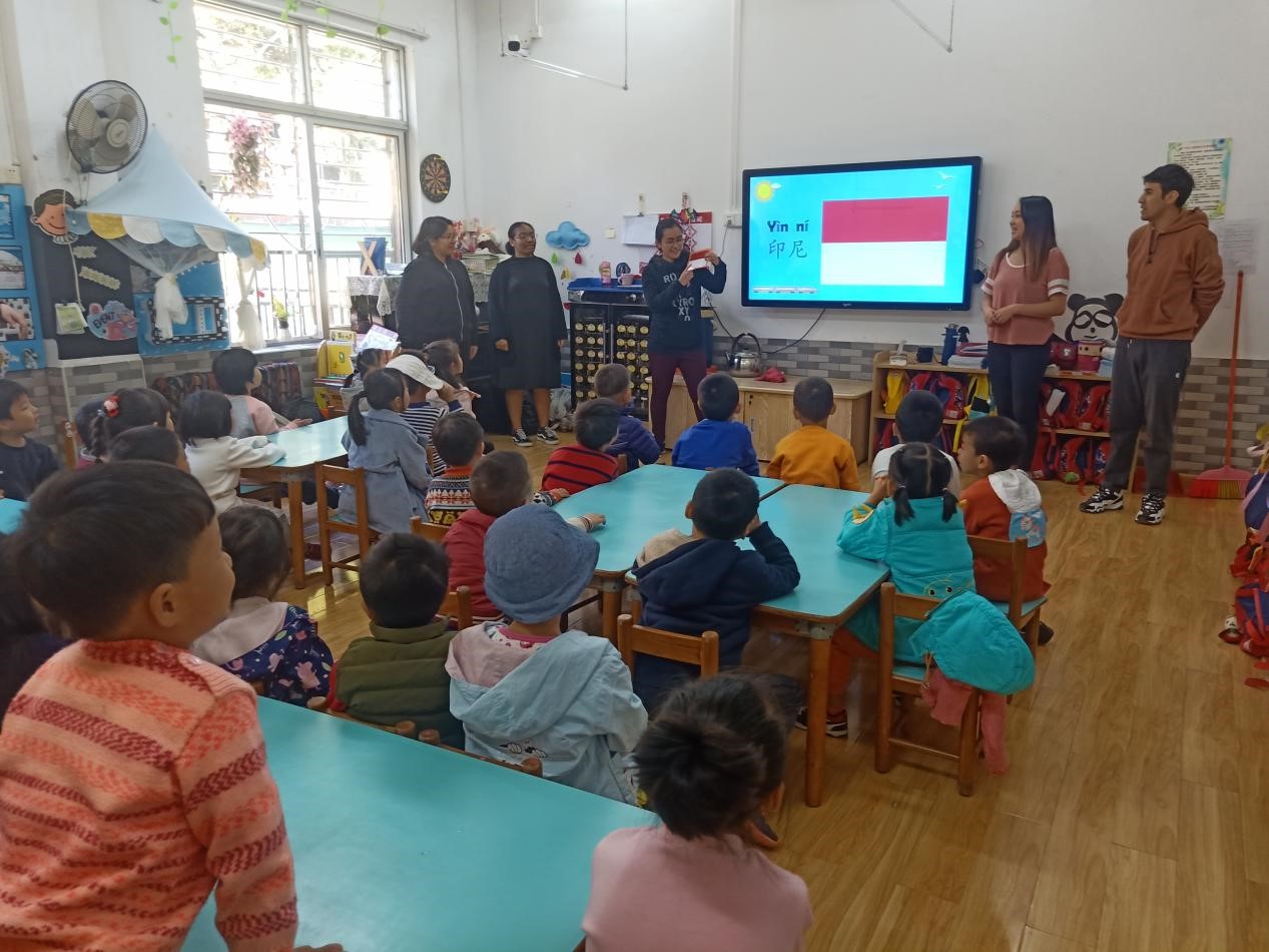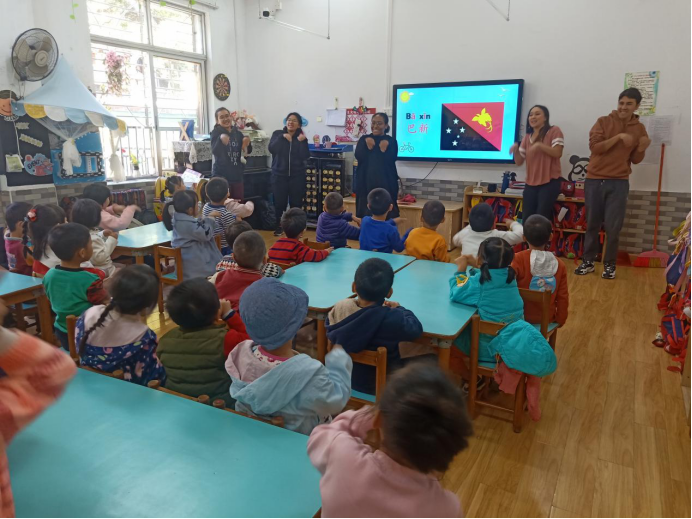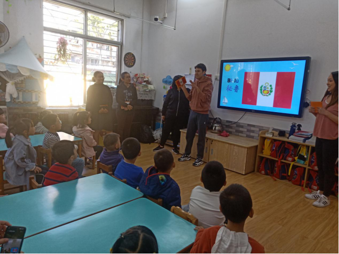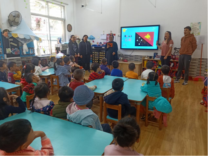 玛拉娣(印尼)、曹璐诗(秘鲁)、胡凯乐(秘鲁)、周雅(巴布新几内亚)、国华(美国)五位汉硕留学生面向广外幼园大三班的小朋友们开展以“认识印尼、秘鲁、巴新、美国四个国家”为主题的义教活动。