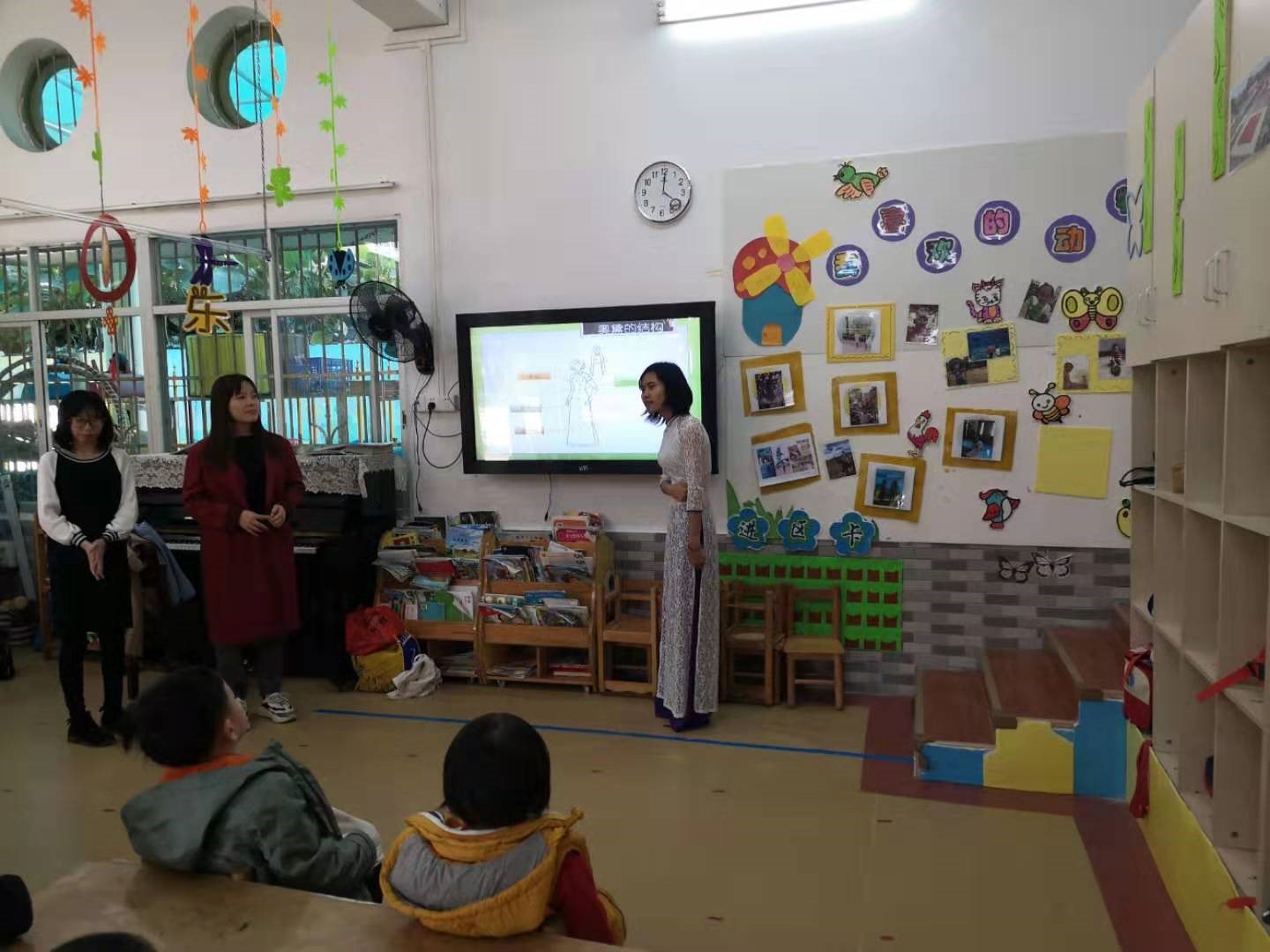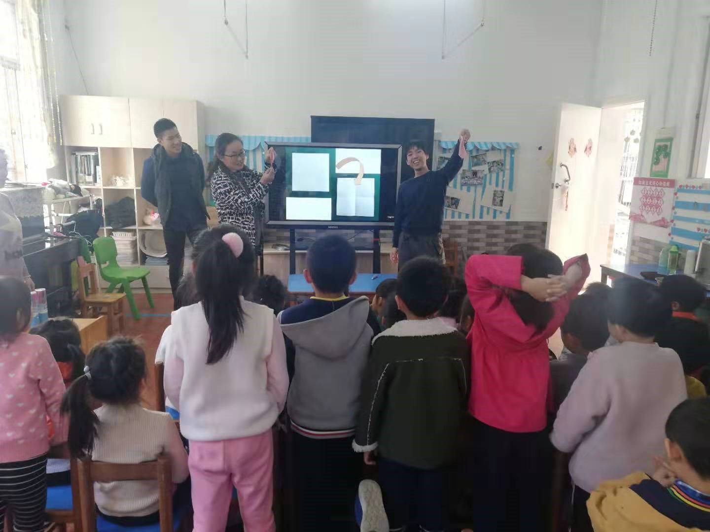 两位来自日本的汉硕留学生被分配到幼儿园大二班进行义教。王媛媛老师作为本次义教活动的指导教师参与到了日本留学生组织的课堂教学活动中。日本同学的教学活动分两个环节。一是由长野匡介绍日本的季节和每个季节的代表景色,二是由镰田隆希教小朋友折纸。