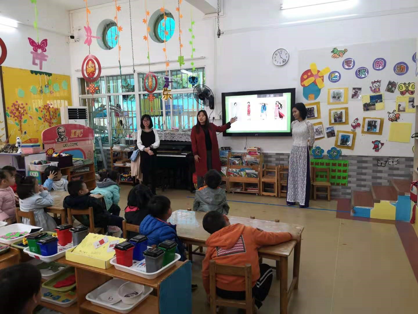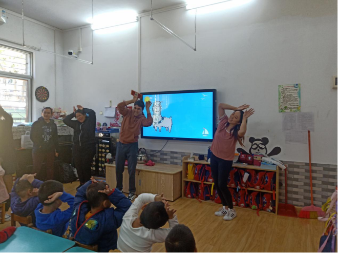 三位来自越南的汉硕留学生被分配到中二班进行义教。一进入教室,小朋友们纷纷带着期待的小眼神向越南留学生问好,有的人说“老师好!”,有的人说“姐姐好!”,接着安静乖巧地坐在自己的小椅子上等待上课。