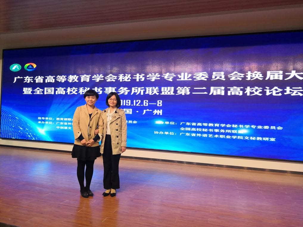 12月7日上午,广东省高等教育学会秘书学专业委员会换届大会暨全国高校秘书事务所联盟第二届全国高校论坛正式拉开帷幕。来自全国50所高校的119名秘书学专家、学者、企业专家和53名学生参加了本次会议,共同见证了广东省高等教育学会秘书学专业委员会新任理事会成员的诞生,探讨了秘书学专业和文秘专业的建设和发展。本次会议由广东省高等教育学会秘书学专业委员会和全国高校秘书事务所联盟主办,广东省外语艺术职业学院和中创慧文(北京)科技有限公司承办。我院教师王焱、王秋萍参加了此次会议。
