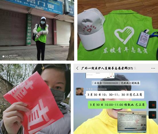 面对疫情,我院学生志愿者积极响应号召,用实际行动助力疫情防控工作,诠释中文人的勇敢与担当,为坚决打赢疫情防控阻击战贡献青春力量。18级学生刘怡婷响应所在区团委号召,积极参与当地高速路口(成都-乐山高速A口和C口)新冠肺炎疫情的排查工作及交通局防疫物资分配工作,贡献战“疫”新力量;16级谢雅婷加入城北镇疫情防控志愿服务队,负责体温测量、信息登记管理、宣传教育等工作,用责任和担当筑起坚实防线;18级何晓彤与19级刘纯积极向所在社区报到,协助开展路口执勤控制出入等疫情防控工作,为打赢这场战“疫”注入青春力量;16级学生杨凯如参与学校“一线医护人员子女线上学习辅导成长陪伴项目”,用行动守护医护人员小家。