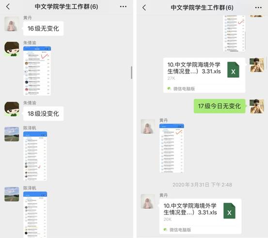 自一月底以来,中文学院辅导员依托“我在校园”小程序及原有的信息反馈通道,及时与班级建立紧密联系,全面摸排、精准掌握包括境外学生在内的所有学生的健康动态、生活轨迹等信息,认真落实全体学生不提前返校的要求,做好教育引导和劝返工作,对湖北等疫情严重地区同学进行了一对一的联络对接,紧密联系、持续跟进,引导学生积极面对学习和生活,用最佳状态和最好姿态坚定打赢疫情阻击战的信心。