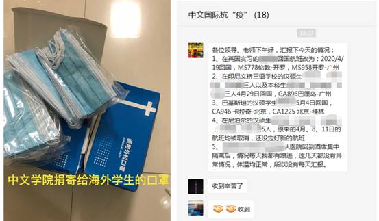 随着国外新冠肺炎疫情的蔓延,中文学院始终关注海外学生情况,并成立境外学生疫情防控工作小组。二月初开始要求全部海外学生每日上报健康情况及定位,并逐一了解学生在海外学习、生活、防疫等方面的情况和需求,指导学生做好防疫工作,安抚学生焦虑紧张情绪,为学生解决难题。同时,学院筹措口罩等防疫物资,为在法国和印尼学习的同学定点邮寄,帮助同学们做好充分的疫情防控措施,“遥寄”关心与爱护。