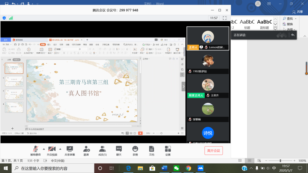 4月29日,第一小组的六名成员参与了由杨帅可老师主持线上“真人图书馆“活动。活动中杨老师通过讲述自己的求学经历告诉同学们教育的重要性,并结合自己的经验回答了同学们关于外语、留学等的问题。