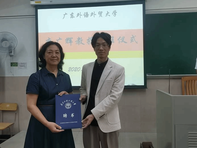 2020年11月19日下午,广东外语外贸大学李广辉客座教授聘用仪式暨中国书法:东方美学哲学思维活动讲座在广东外语外贸大学北校区第二教学楼131课室举行。中国语言文化学院党委书记周东兰,党委副书记王迪,辅导员陈泽帆老师出席本次活动,本次活动由对外汉语系主任邱春安老师主持。