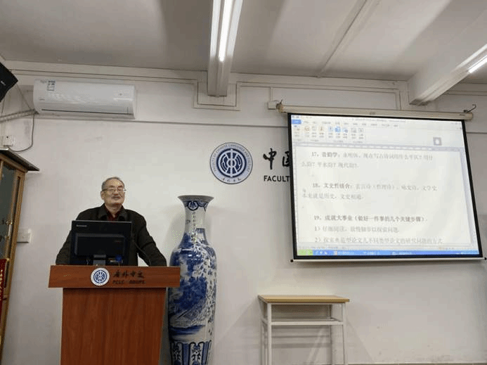 接下来胡大雷教授详细介绍了许多治学的具体经验,例如:学习古代文学应按部就班;至少熟读一经、一子、一史、一集;读史书有技能性训练;了解文学纪事、文学背景;研究性学习的进行;对文史哲结合的重视;对音韵学、文字学、语义学的介绍等等。