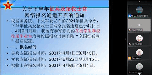 2021年4月16日下午,中文学院西部计划、征兵入伍宣讲会在线上举行。活动由我院副书记王迪主持,并特别邀请了省团委青年志愿者行动指导中心团干李丽英老师、广东外语外贸大学保卫处朱永海老师以及广外国政专业参军退役学生翁博洋。他们为我院学生做了一场具有针对性的、专门性的西部计划及征兵入伍宣讲会。本次会议充分体现了学院对国家相关政策的支持、对学生未来发展规划及职业发展方向的充分关注。