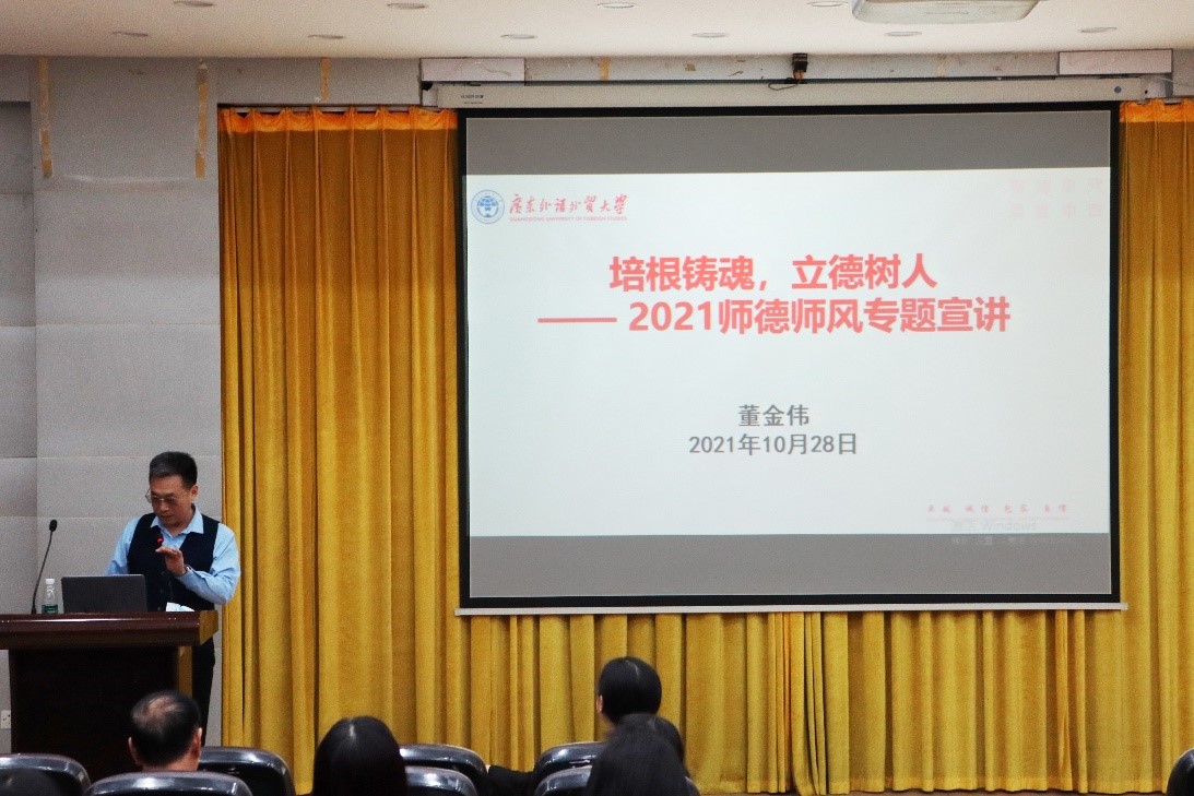 本网讯 2021年10月28日下午,中文学院在七教106开展师德师风专题宣讲会,广东外语外贸大学师德师风宣讲团成员、师德标兵董金伟院长主讲,中文学院党委书记周东兰书记主持,中文学院全体教师出席会议。