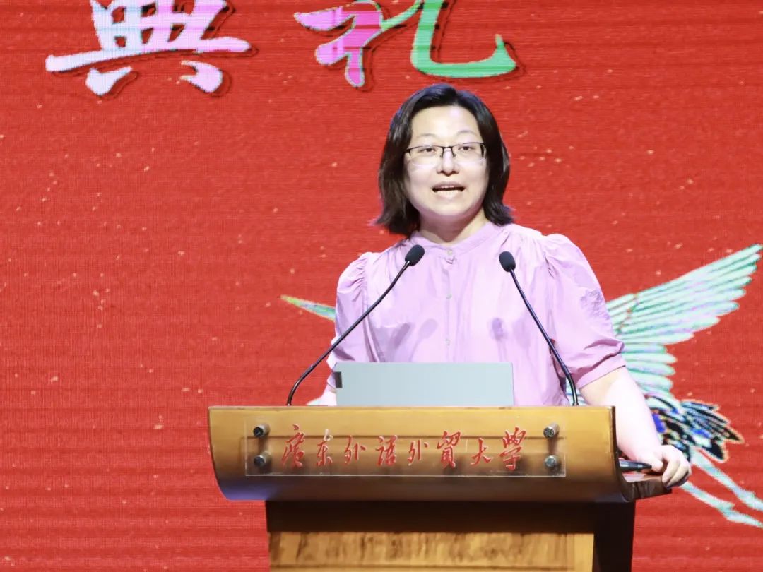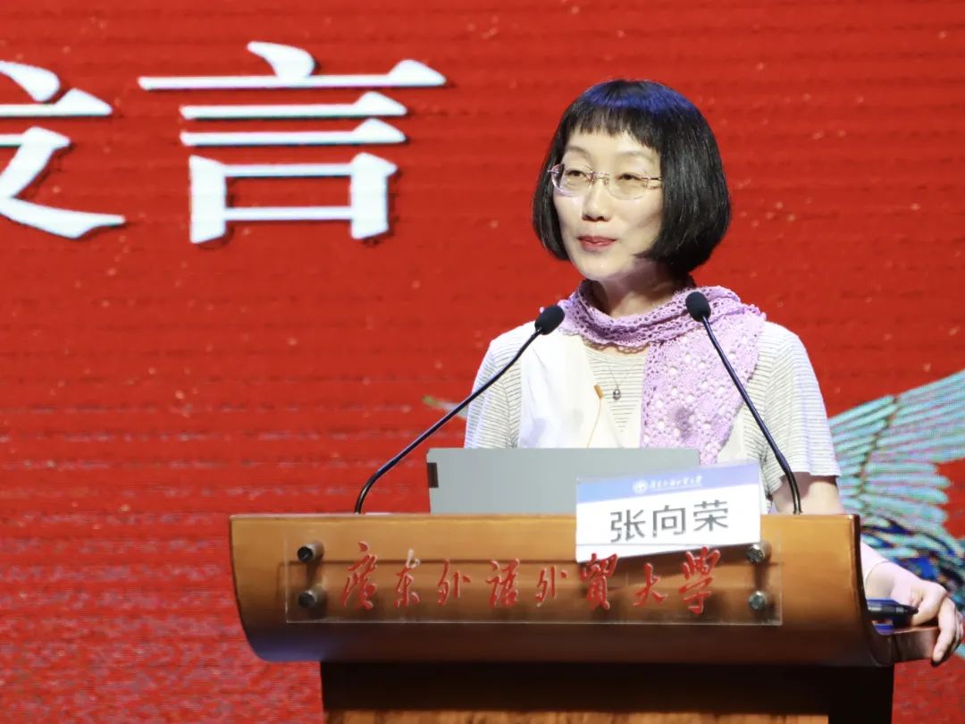 接着,教师代表张向荣发表讲话。她描述:“文学是一抹朝阳,是生命中的一束光。”大学的任务不是回答问题,而是解决问题,读书、思考、探究真理,是人生的滚滚车轮中最重要的几环。“广外目送你绽放精彩,广外中文等着你踏浪归来!”张向荣老师为大家展现了语言的魅力和中文人的浪漫与风采。