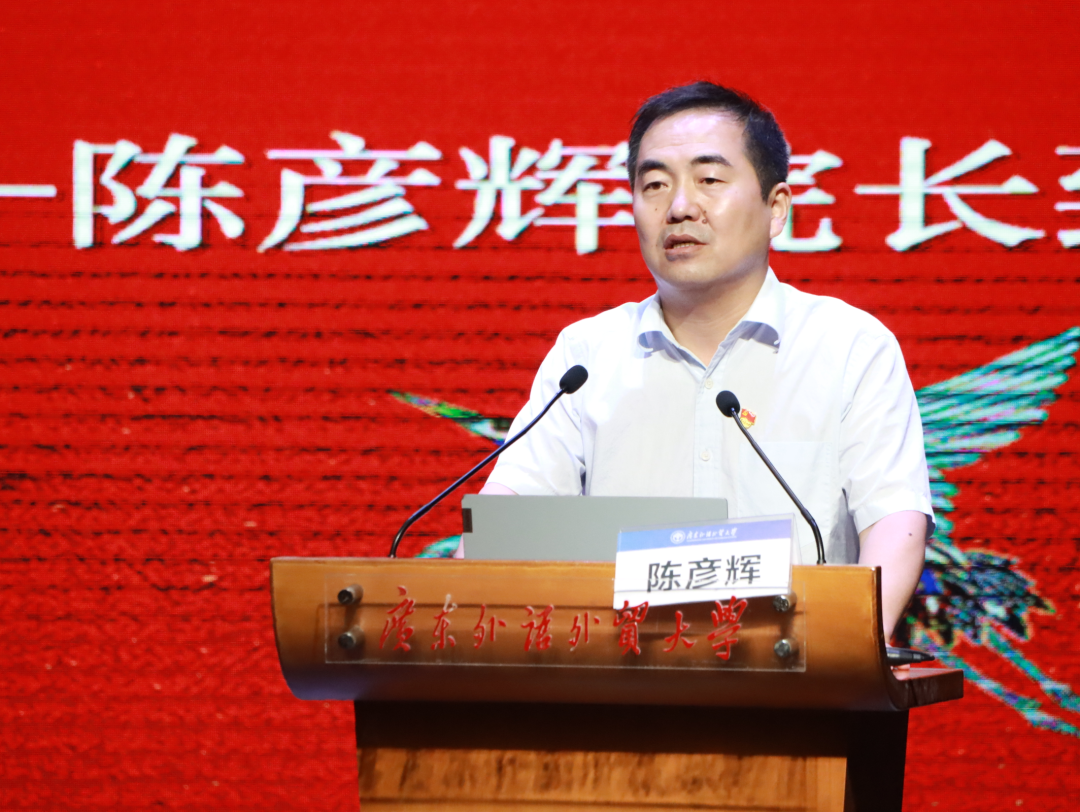 中文学院22级全体新生及老师进行了庄严的升旗礼。随后,中国语言文化学院院长陈彦辉致辞。陈院长指出时代背景下广外中文人应该承担中华民族伟大复兴的任务,并向新生们提出深切希望。