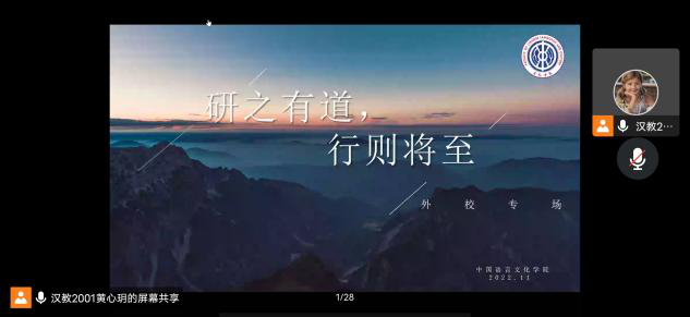 继广东外语外贸大学中国语言文化学院成功举办了第一场考研经验分享会后,为使尚未考研的同学进一步了解考研相关资讯,了解更多备考学习方法,中国语言文化学院于2022年11月11日晚上七点组织了第二场《“研”之有道,行则将至》经验分享会。会议由中文学院20级级长黄心玥主持,同时邀请到了两位18级成功被心仪学府录取的师兄师姐分享备考经验与心得。我院近300名师生共同聆听本次讲座。