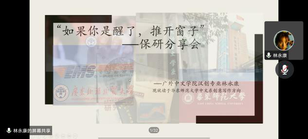 紧接着,由18级广外汉创专业毕业生,现就读于华东师范大学的林永康师兄介绍自己的保研经验。林师兄仔细介绍了保研的概念和流程,让同学们对保研有了初步的认识。然后,师兄就保研信息方面的准备进行了祥尽的讲解,鼓励同学们要建立自己的信息库。另外,林师兄还分享了自己的面试经历,帮助同学们了解不同院校的考试方式。