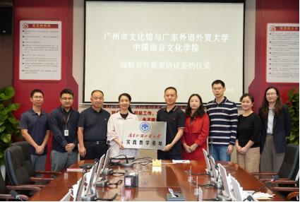 随即,在与会成员的见证下,我校中文学院党委副书记吴俊峰和广州市文化馆馆长董敏签署了战略合作框架协议,随后举行了“广东外语外贸大学教学实践基地”授牌仪式。