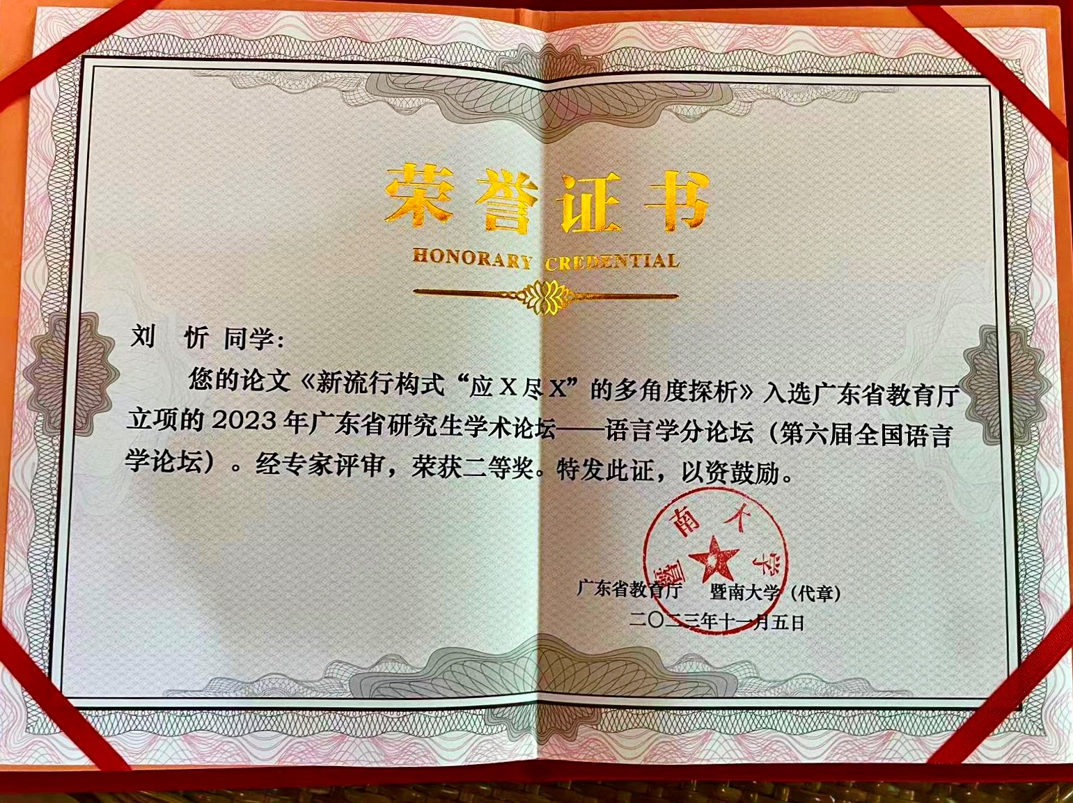 2023年11月4-5日,“2023年广东省研究生学术论坛—语言学分论坛(第六届全国语言学论坛)”在暨南大学成功举办。经过现场宣读、答辩,专家匿名评审,我院2021级语言学及应用语言学专业硕士研究生刘忻荣获二等奖。