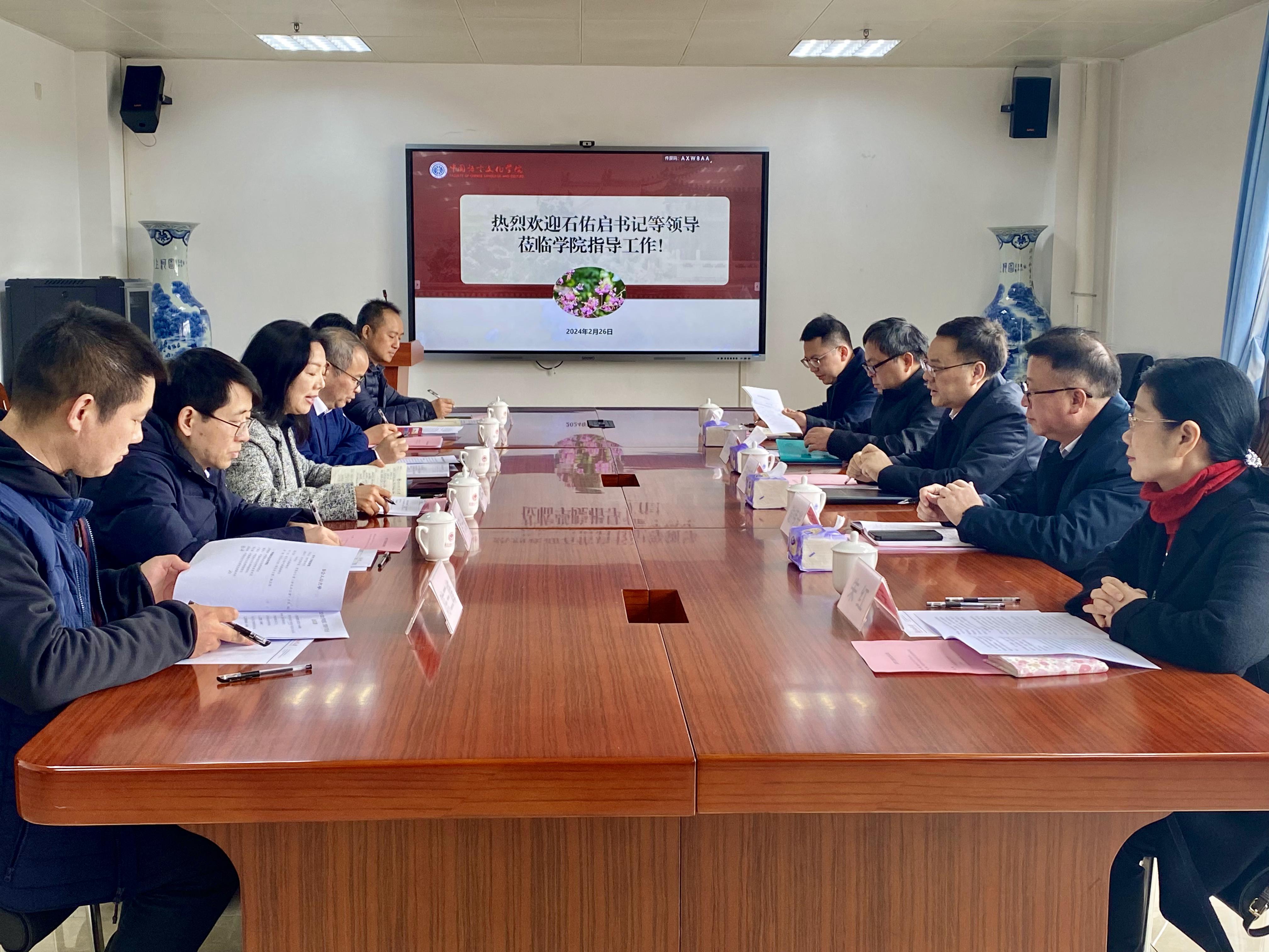 2024年2月26日下午,校党委书记石佑启一行到中文学院检查新学期开学工作。校党委常委、党委办公室(校长办公室)主任、统战部部长谢伟光,人力资源部部长谢文新,财务与资产管理部部长朱红,党委办公室(校长办公室)副主任李韬陪同检查。